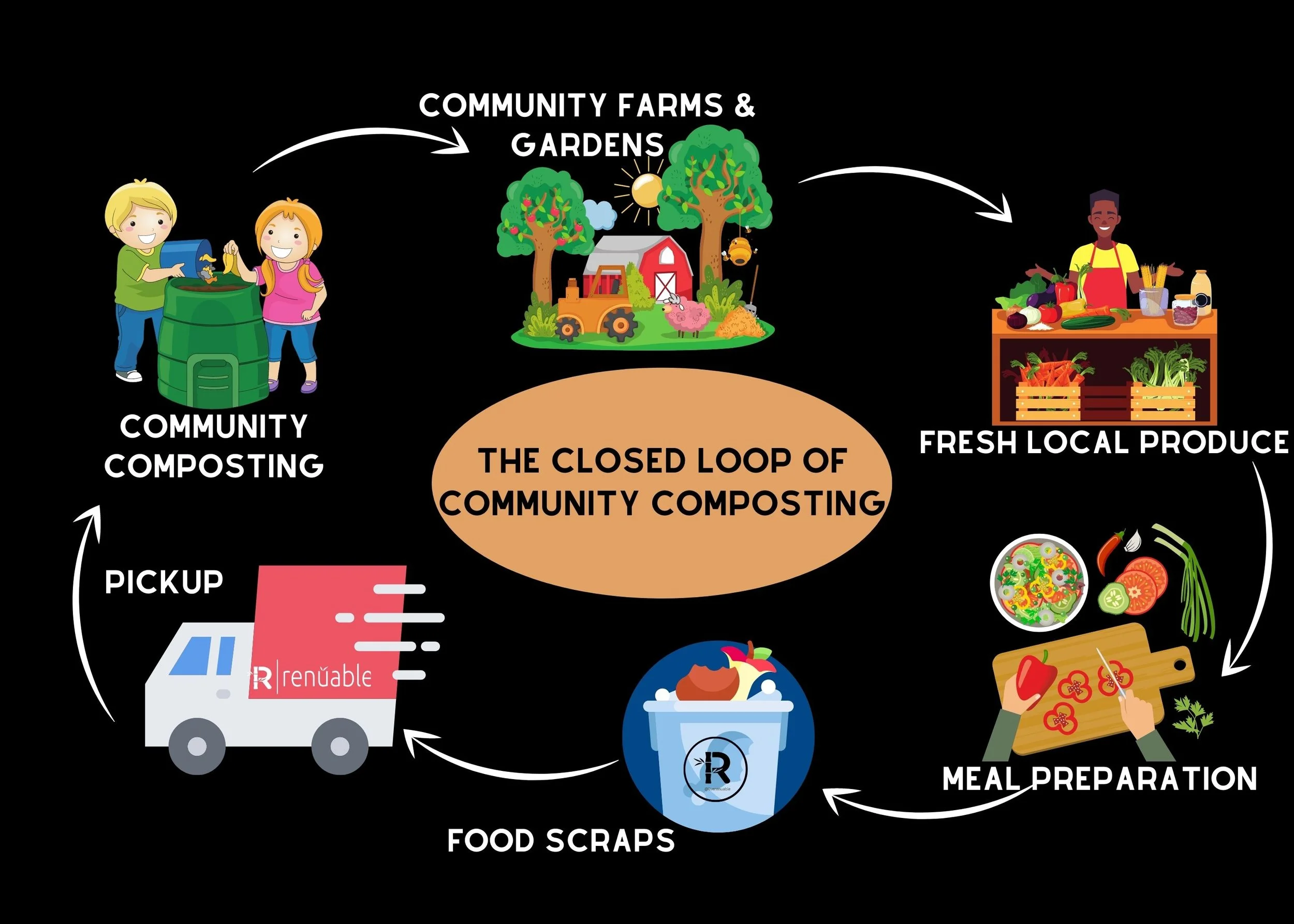 Composting services for businesses of any size, from small restaurants, local breweries, schools, and flower shops, to large stadiums, catering companies, or convention centers offering zero-waste events for their clients.